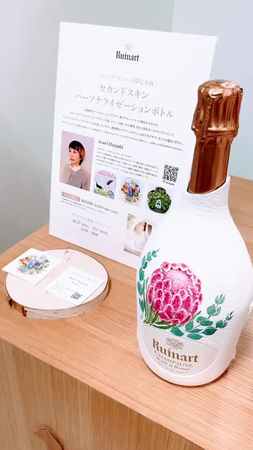 「KYOTOGRAPHIE京都国際写真祭」に出展した、シャンパーニュ「Ruinart」の展示・販売ブースにて、シャンパンボトルの白いパッケージに水彩画にて植物をお描きする、ライブペイントの受注制作を行いました。会場に用意した花瓶の中からお客様に好きなお花をお選びいただき、目の前で描いていくというパフォーマンスです。